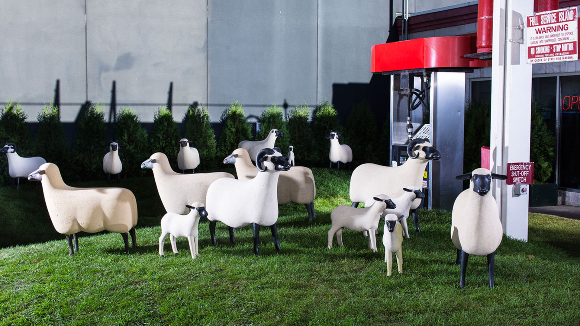 A Getty station is not a place you’d expect to see art-world insiders congregating on a beautiful September evening. Yet there they were Monday night on the corner of 24th Street and Tenth Avenue in Manhattan, sipping wine and nibbling on hors d’oeuvres amid the now-defunct gas pumps. The occasion was an exclusive party celebrating the opening of “Sheep Station,” a daring exhibition of 25 epoxy-and-bronze Mouton sculptures by French artist François-Xavier Lalanne (1927–2008).
