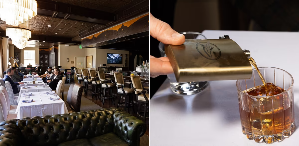 A composite image shows patrons sitting at tables at the Club at Wingtip and a Wingtip staff member pouring a drink from a flask, also at the Club. | Benjamin Fanjoy for The Standard