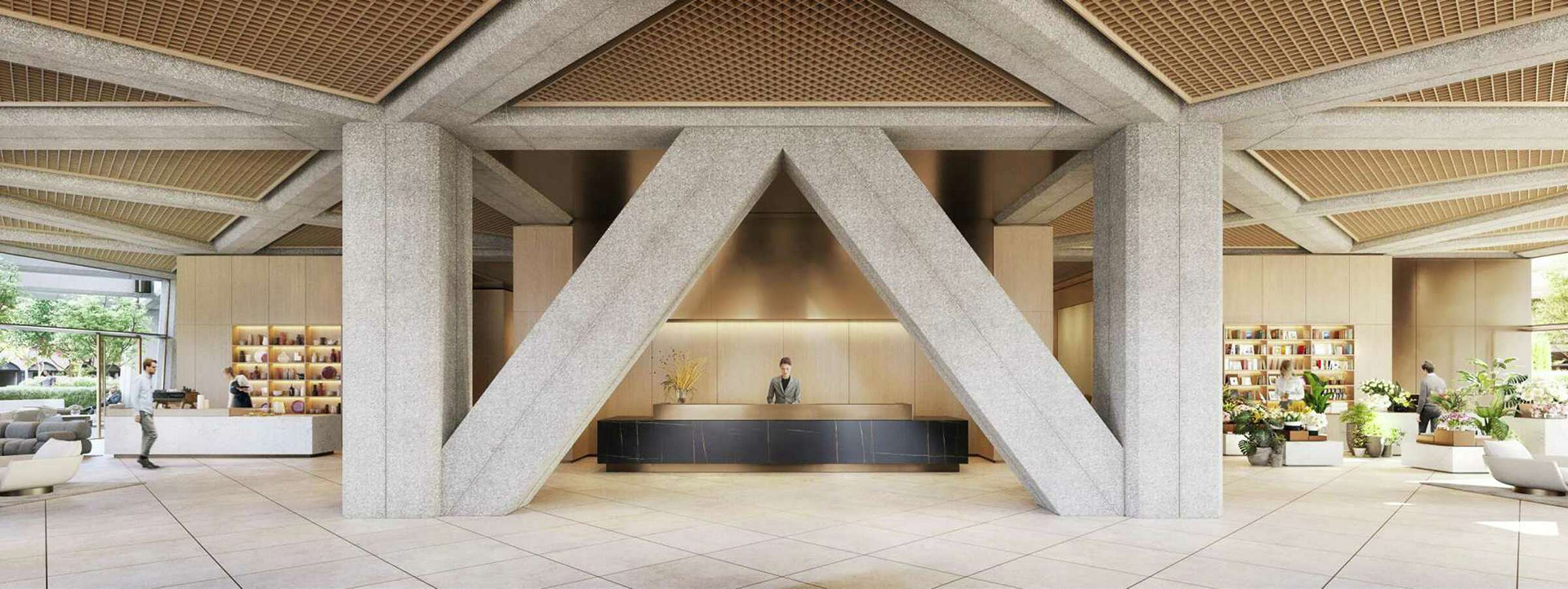 A rendering of the renovated lobby of the Transamerica Pyramid.