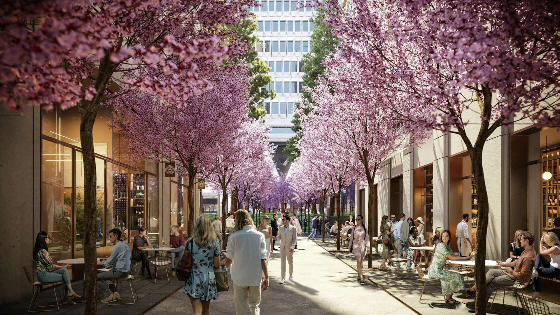 A rendering of the new Mark Twain Street with cherry blossom trees and new shops.