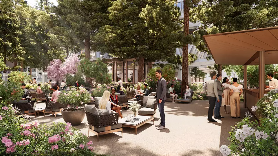 A rendering of the redeveloped park outside the Transamerica Pyramid, which will be completed as part of the property’s updates. SHVO