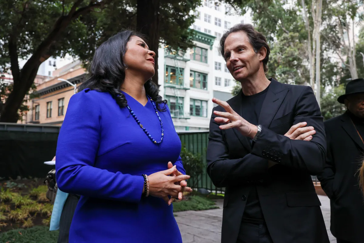 Mayor London Breed speaks with Michael Shvo, real estate developer and CEO of Shvo, at the celebration of the Transamerica building’s 50th birthday and interior renovation by Shvo development. | Source:Camille Cohen/The Standard